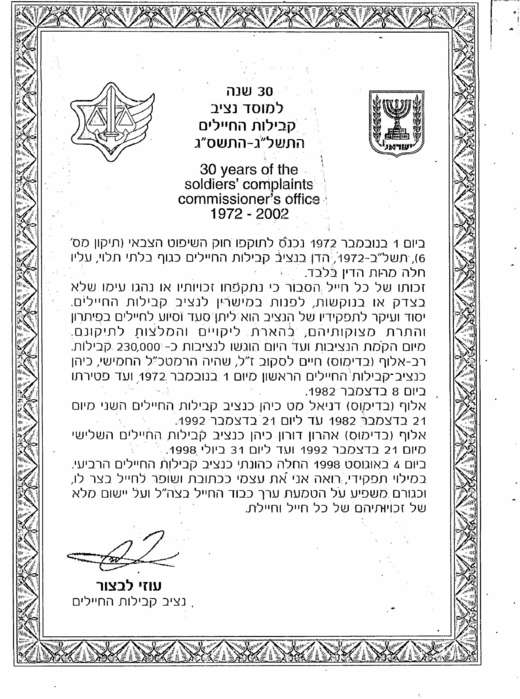 30 שנה למוסד נציב קבילות החיילים – מכתב נציב קבילות חיילים, תא"ל (מיל') עוזי לבצור.