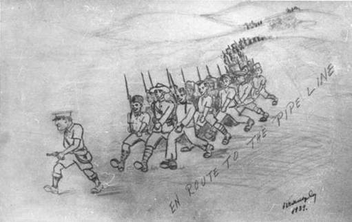 רישום היתולי שנעשה בידי אחד מאנשי הפּלגות, המציג את וינגייט מוביל אותן בפנים נחושות ובאקדח שלוף לאורך קו צינור הנפט.