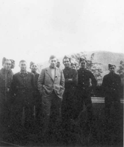 וינגייט בחברת אחדים מאנשי הפּלגות בחצר בית הספר החקלאי 'כדורי', שם הן קיימו מסדר פרידה לכבודו.