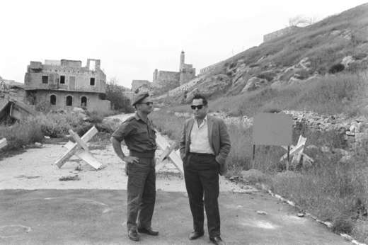מפקד פיקוד מרכז אלוף עוזי נרקיס עומד בקרבת הגבול העירוני במדרון המערבי של הר ציון ברקע מגדל דוד,2.5.1967; צלם:מיקי אסטל,ב1 -"במחנה", 6160/6,ארכיון צה"ל ומעהב"ט