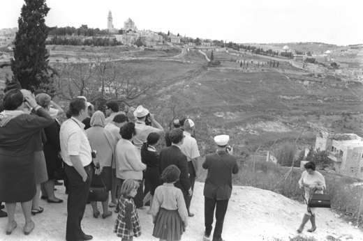 תיירים מבקרים בקו העירוני בירושלים לפני מלחמת ששת הימים,הר ציון,כיפת אל-אקצא וכיפת מסגד הסלע,2.5.1967;צלם:מיקי אסטל, ב-1"במחנה",6160/63,ארכיון צה"ל ומעהב"ט