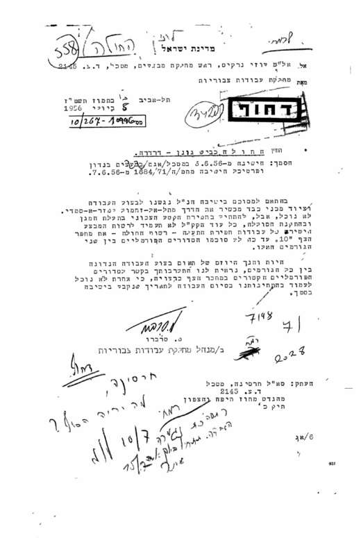 מכתב ממנהל מחלקת עבודות צבוריות לאל"מ עוזי נרקיס בדבר החולה, כביש גונן-דרדרה.