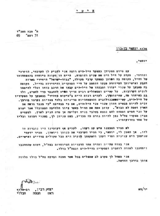 דברי רא"ל יצחק רבין, ראש המטה הכללי עם סיום תפקידו של אלוף יוחאי בן נון כמפקד חיל הים: