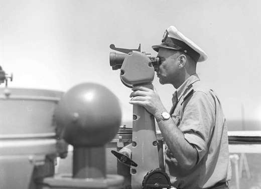 הפלגת משחתות ליוון, סא"ל יוחאי בן נון קברניט השחתת "יפו" על גשר הפיקוד, 13.6.1957; לויטה יוסף, אוסף ב-1"במחנה",1644/69, ארכיון צה"ל ומעהב"ט