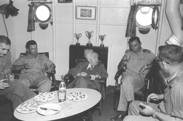 מפקד חיל הים אלוף יוחאי בן נון ראה"מ ושהב"ט לוי אשכול על גשר הפיקוד של המשחתת אילת, 12.7.1963; אברהם ורד, אוסף ב-1"במחנה" ,4706/5 , ארכיון צה"ל ומעהב"ט
