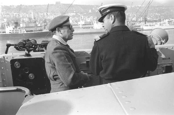 הרמטכ"ל רא"ל צבי צור ומפקד חיל הים אלוף יוחאי בן נון על גשר הפיקוד של משחתת חיל הים בבסיס חיפה, 28.2.1962; אברהם ורד, אוסף ב-1"במחנה" ,4101/7 , ארכיון צה"ל ומעהב"ט