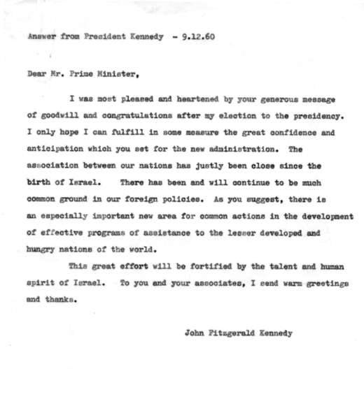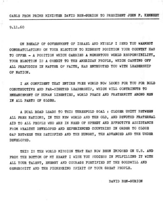 מכתב הברכה של דוד בן-גוריון עם כניסתו של ג'ון פ. קנדי לכהונת הנשיא: